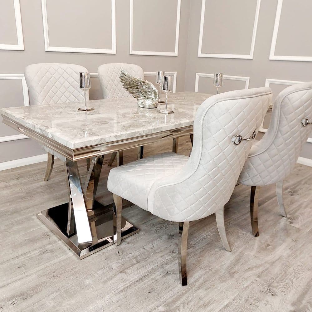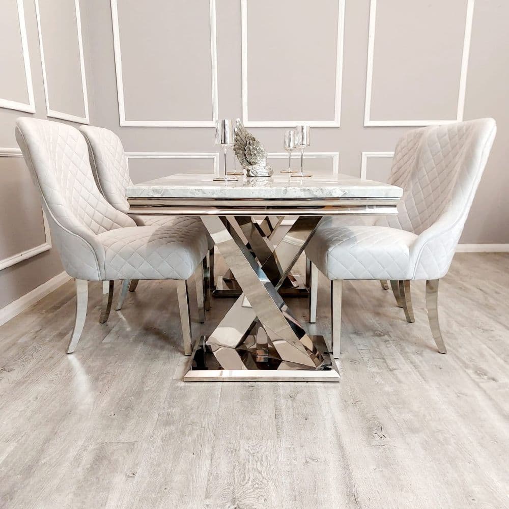 Create an instant focal point for your dining space with our new Xavia Dining Table. Ultra chic and stylish, this contemporary dining table redefines high end living. Comprising of a beautiful 1.8 meter top which is available in a selection of marble or glass. Complemented with a polished stainless steel double x leg base. Our marble, Sintered Stone and glass tops are incredibly hardwearing and scratch resistant. The sleek lines and smooth materials make the Xavia Dining Table an easy to clean piece of furniture. This dining table comfortably seats six dining chairs.