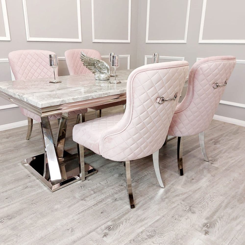 A brand new line is our beautiful Kate Dining Chair. Featuring stunning quilted back detail with our brand new style chrome clasp and complete with our curved signature Chrome Legs. A beautiful piece that would compliment any of our Dining Tables. The Kate Dining Chair is finished in a soft velvet fabric.
